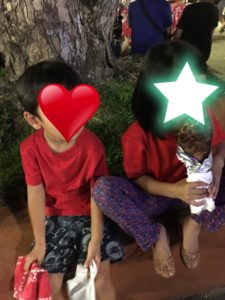 なぜか、到着したら大歓迎で、子供達プレゼント貰ってる!お店のバンダナみたいなのをみんなつけてもらってる!