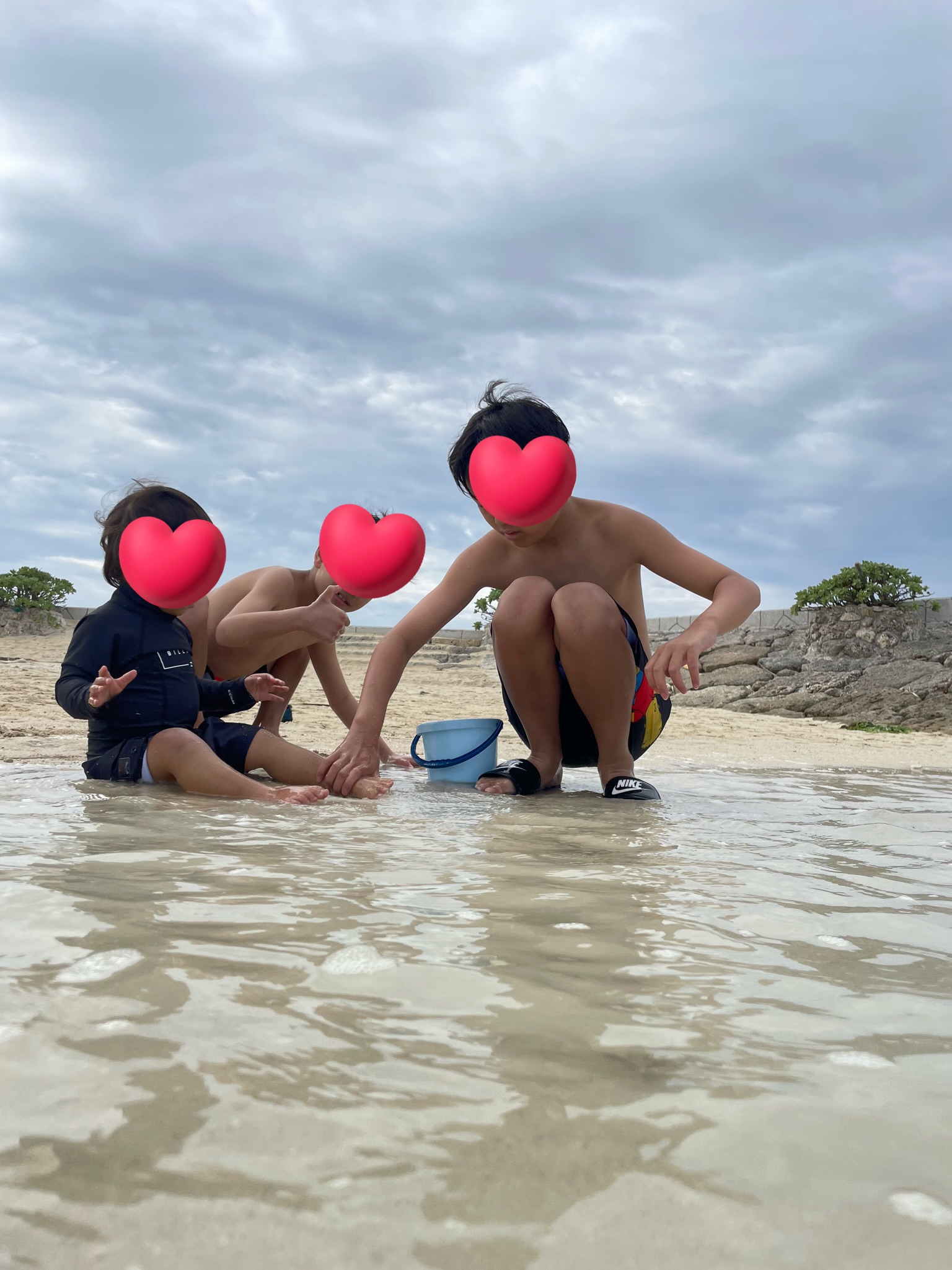 そんな間三男ベビーは砂浜で砂遊び!お砂場セット持ってきててよかった!珊瑚🪸もいっぱい落ちてたからバケツに入れたりだしたりたのしんでた💙